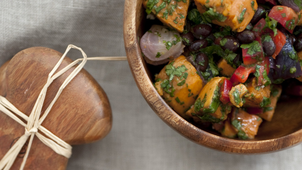 Start with sweet potatoes, which are in season, beautiful and cheap, and roast them with red onion and olive oil. Roasting instead of boiling makes a huge difference: not only do you get a rich, smoky flavor, but the peeled exterior is toughened a bit so that the potatoes stay intact when tossed with the other ingredients. You can serve this sweet potato salad warm or at room temperature; it’s great both ways.