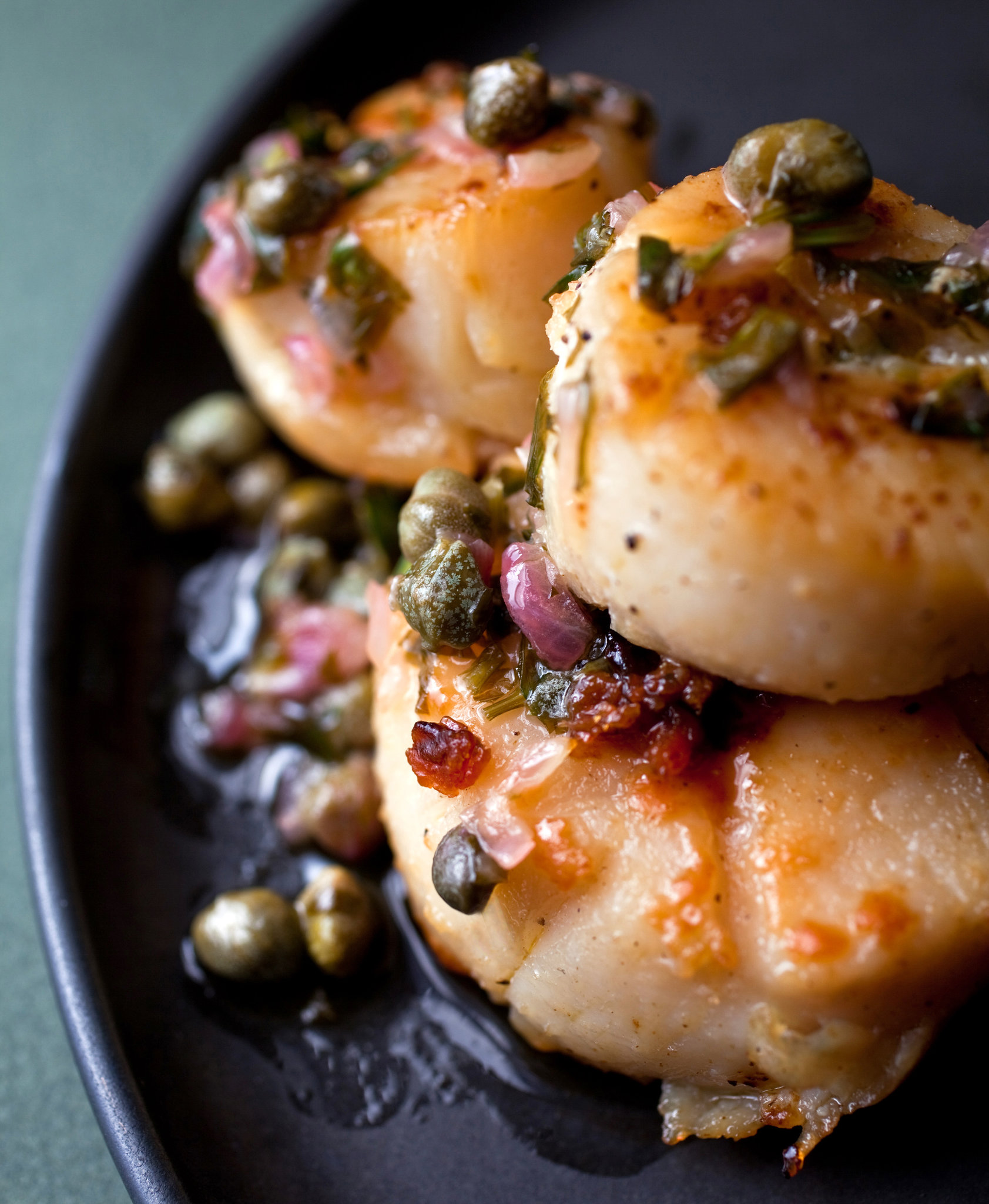 - To serve, place 3 scallops on each of 4 warmed plates. Spoon butter, shallots and capers over scallops, and serve.