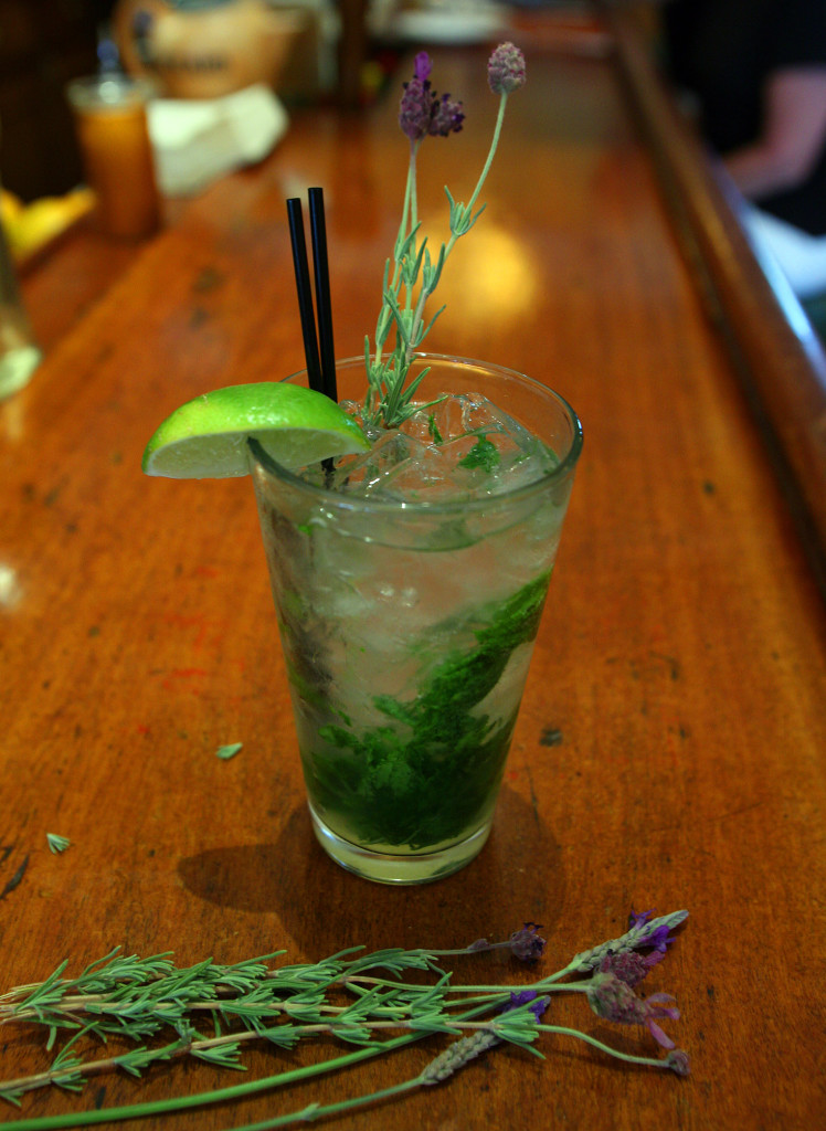 1. In a pint glass, muddle mint leaves with lavender syrup. Add rum and lime juice. Stir, fill glass with ice, and top with seltzer. Garnish with lime wedge.