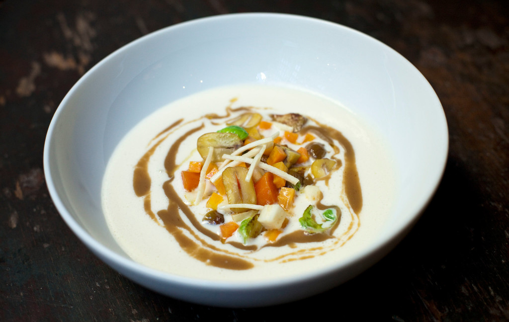 As you dig into this soup, with its white, soft and silky base, each bite has a whole new texture, Mr. Anthony explains. “This really complex soup is beautiful and delicious,” he says, “And a great example of what’s falling from the trees and coming out of the garden.