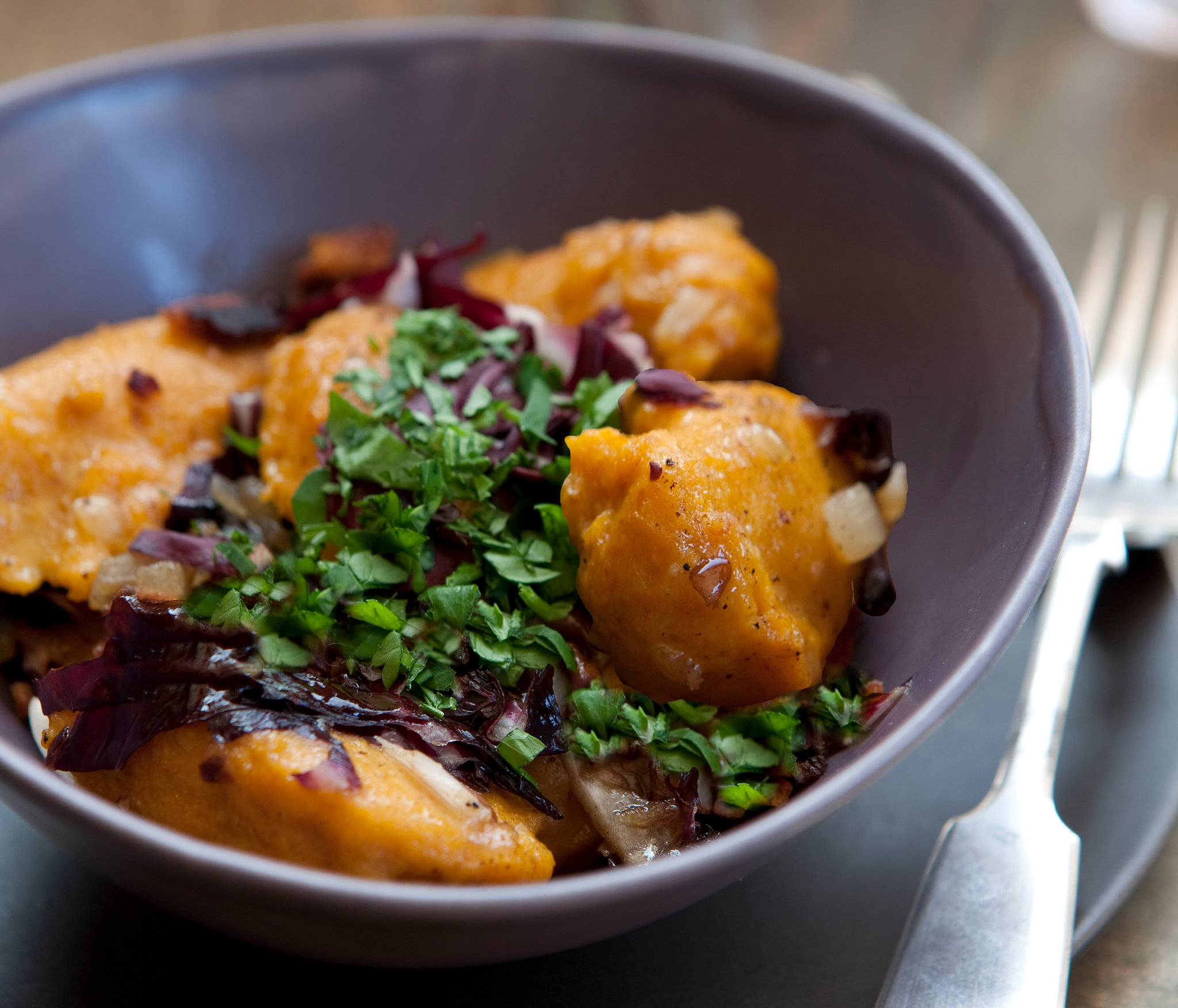 - Return the saucepan with the onion to medium-high heat. Toss in three-quarters of the radicchio and stir gently until just wilted, about two minutes; season with 1/2 teaspoon salt or to taste. To serve, divide the dumplings and sauce among four bowls and top with the remaining radicchio and parsley.