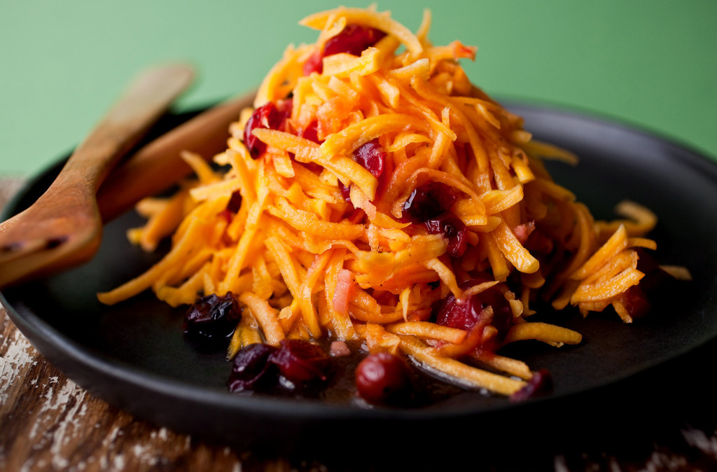 - Meanwhile, grate the butternut squash by hand or in a food processor. Transfer the squash to a large bowl, add the warm cranberry dressing, and toss to combine everything. Serve warm or at room temperature. (Or cover and refrigerate the salad for up to several hours; bring to room temperature before serving.)