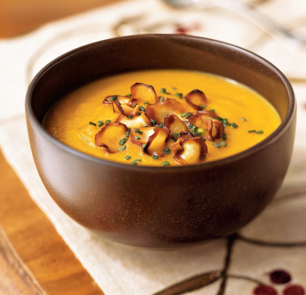 - Heat remaining 5 teaspoons oil in a small saucepan over medium-high heat. Add parsnip slices; cook 5 minutes or until lightly browned, turning occasionally. Drain on paper towels. Sprinkle parsnip chips and chives over soup.