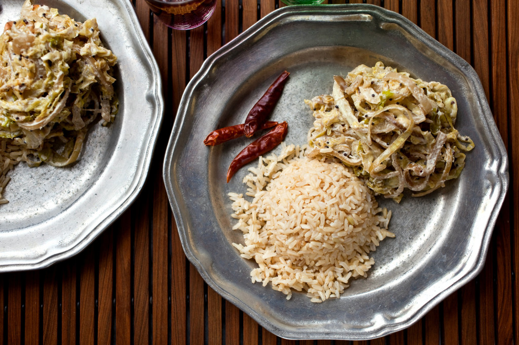 This spicy curry is inspired by a recipe by the cookbook author Madhur Jaffrey. I’ve seen other vegetarian recipes for cabbage cooked with dal (which I’ve made optional here, so you don’t have to go to a special Indian market), spices and coconut, but this one is the only one I’ve seen that’s enriched at the end with warmed yogurt. Make sure that you don’t let the yogurt get too hot or it will curdle. For a vegan dish, omit the yogurt.