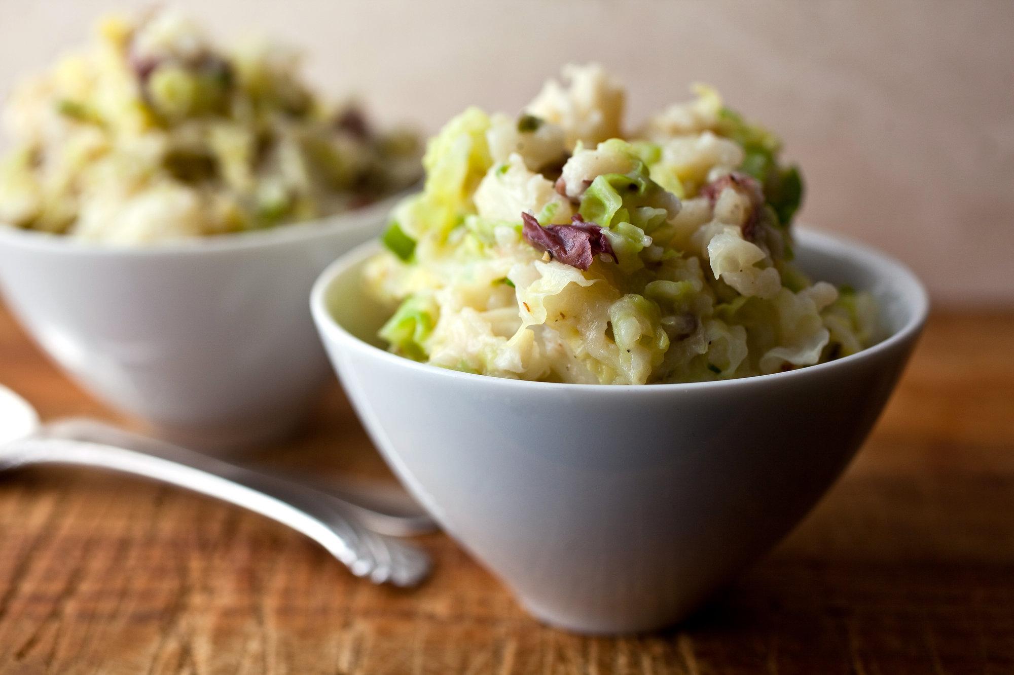 I set out to make a traditional Irish colcannon here, a mixture of mashed potatoes with cabbage and scallions. But I decided to go with a lighter carbohydrate load, using red boiling potatoes rather than starchier Idaho potatoes. Instead of making a purée of them, after cooking the potatoes in their skins I quarter them and, skin and all, smash them in a hot pan with a potato masher or the back of a spoon.
