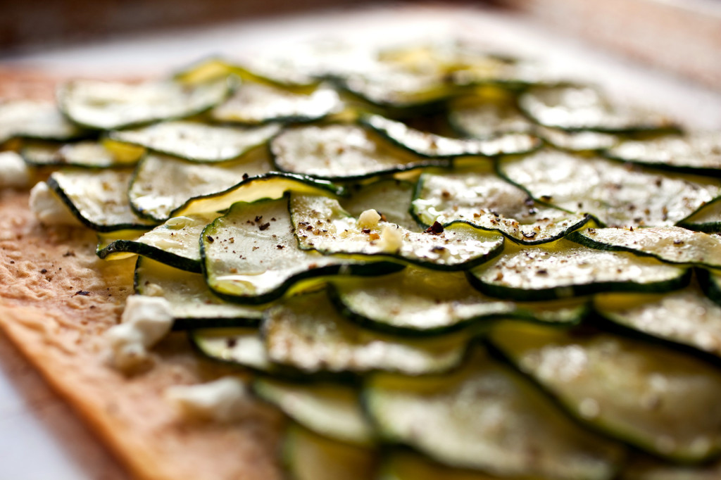 - Place the lavash on a baking sheet. Sprinkle the goat cheese over the lavash. Arrange the zucchini on top in overlapping rows. Drizzle on the remaining olive oil, and place in the oven. Bake 15 minutes until the lavash is crisp and browned on the edges. Remove from the heat, sprinkle on the mint and serve.