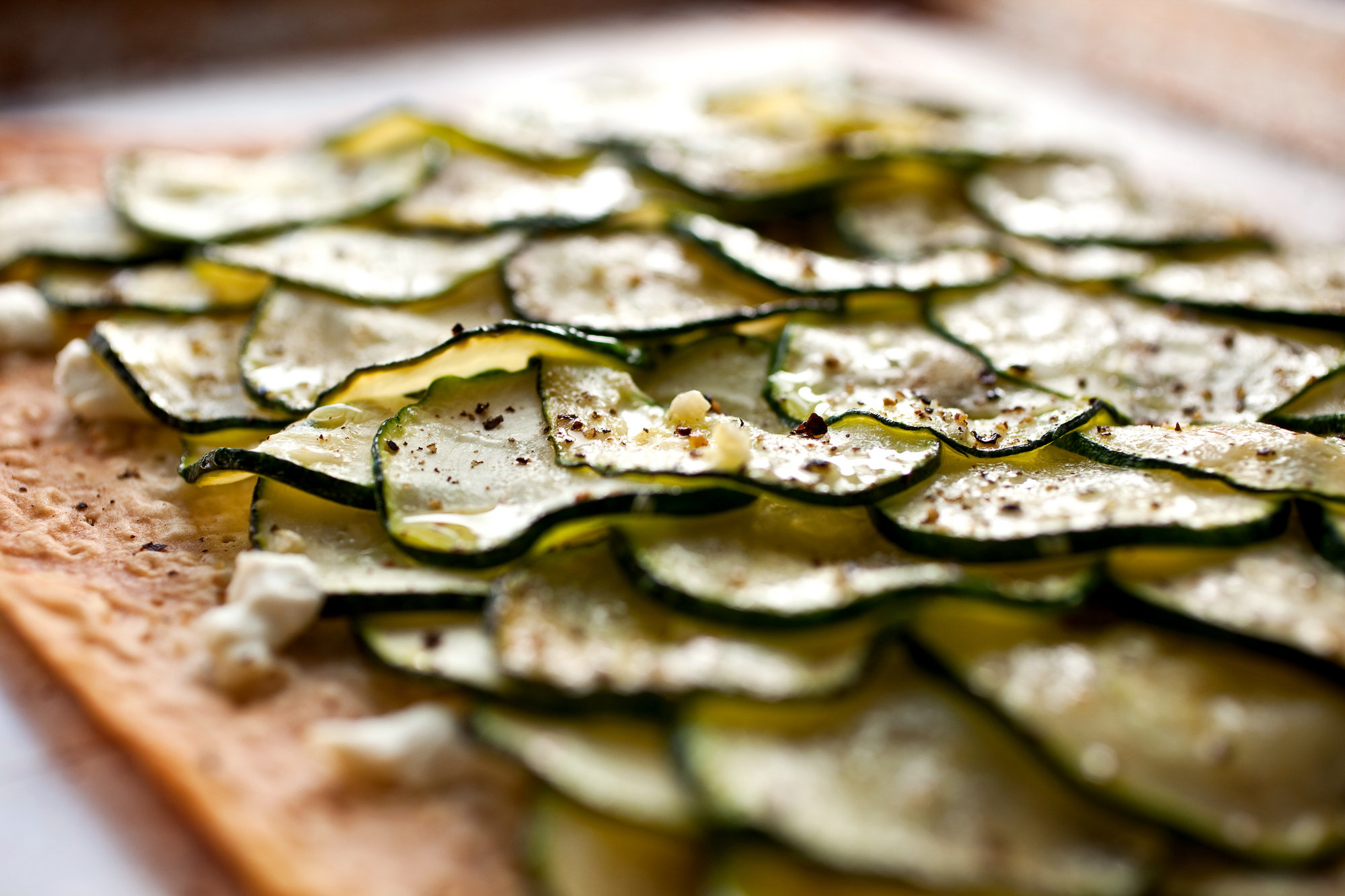 Certain dishes are perfect for zucchini, and this is one of them. It looks beautiful here, and the goat cheese and mint are perfect partners.