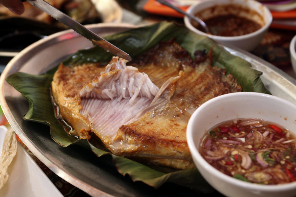 - Cook the fish: Rinse and dry the fish and sprinkle it with salt. Heat a grill to high, or place a heavy skillet (with a lid) over medium-high heat. Spread one side of the fish with a thin layer of sambal. Place a banana leaf on grill (or in skillet), drizzle lightly with vegetable oil and place the fish on top, sambal side up. Cover grill or pan and cook about 8 minutes, until the banana leaf is toasted and the sambal is dry and fragrant. Remove the leaf and fish from the heat. Place a new banana leaf on grill or in pan, drizzle it with oil, flip fish onto it and spread more sambal on top. Cover and cook another 6 to 8 minutes, until cooked through.