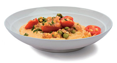 4. While the milk and water are coming to a boil, halve the tomatoes and add them, with the vinegar, to the onions and garlic. Cook for about 2 minutes, then add the edamame and corn and cook for 3 more minutes, stirring occasionally. Add salt and pepper to taste.