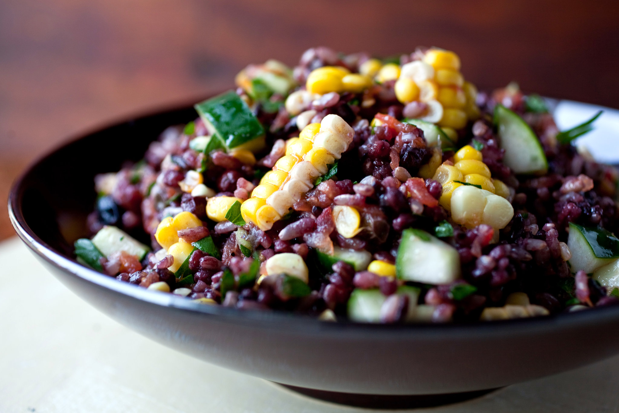 You can use a variety of grains in this salad. I’ve made it with a mixture of brown rice and farro, with quinoa and with bulgur. The mixture makes a robust main-dish salad for summer.