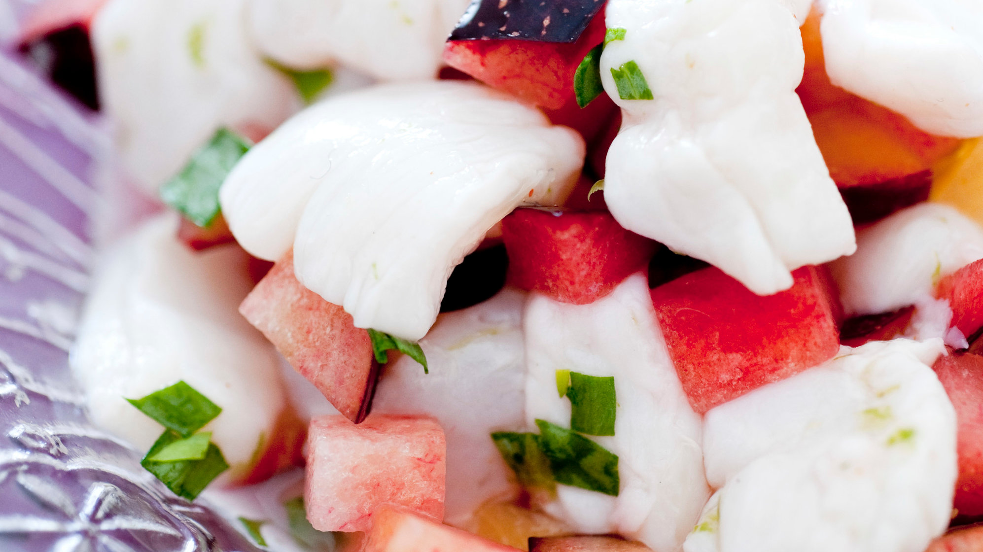Ceviche is a perfect summer appetizer: light, refreshing and cooking-free. Citrus — sometimes lemon or bitter orange, but in this case lime — does the “cooking” for you. It doesn’t get much simpler than this: a few minutes of chopping, a few seconds of stirring and a quarter of an hour of doing absolutely nothing.