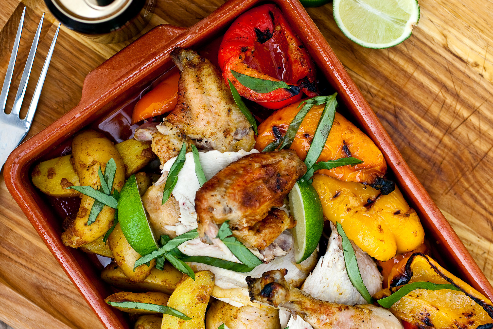 - Carve chicken and garnish with lime wedges and basil before serving with potatoes and peppers.