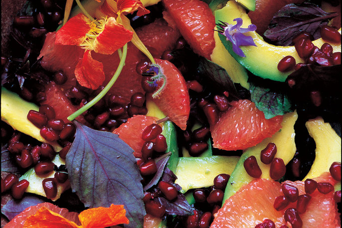 - Peel grapefruits with a sharp knife, cutting away all white pith. Cut between membranes into individual segments, and place in a bowl along with any juices. Halve avocados, removing peel and pits. Slice into thin wedges and add to bowl with basil. Cut pomegranate crosswise. Holding a half cut-side down over bowl, hit the back side until all seeds have been released, then repeat with other half. Season with salt to taste, and toss lightly.