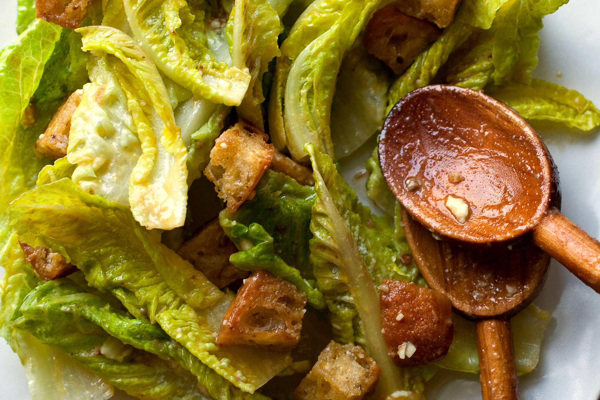 - Combine lettuce, cheese and croutons in a large bowl. Add vinaigrette and toss well. Crack eggs into salad, scooping out any whites clinging to shell and toss once more. Add salt to taste.