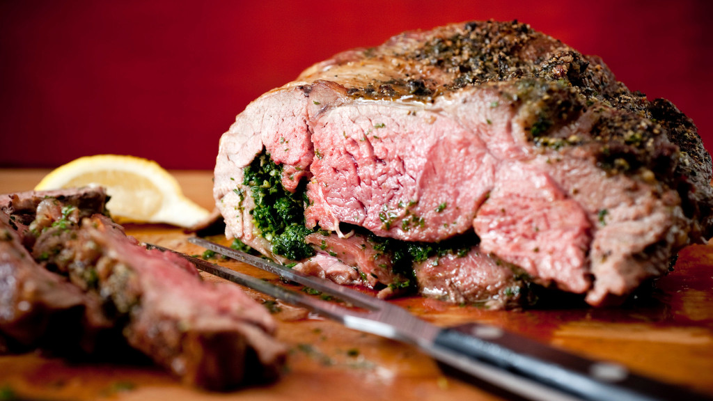 - Sprinkle lamb with salt and pepper on both sides, then turn so the side that had been on the bone, the one with the more irregular surface, is facing up, with the wider end facing you. Smear the surface of lamb with most of persillade mixture, then fold it in half (there will be a kind of natural hinge, as you’ll see) with persillade on the inside. Smear the remaining persillade on outside of the lamb and sprinkle with salt and pepper.