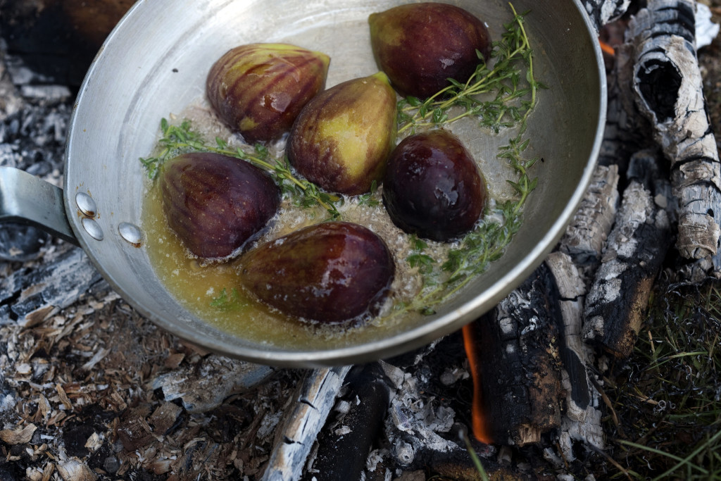 - Spoon the honey over the cut sides of the figs. Heat a large, heavy skillet over a medium-high flame. Add the butter — it should sizzle briskly when it hits the pan. Throw in the thyme sprigs, followed by the figs, cut sides down. Leave undisturbed for 3 to 5 minutes to caramelize, then turn the figs over and cook for another minute.