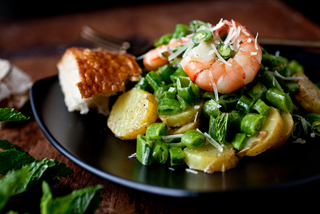 - When the shrimp are cool, toss with the peas and remaining vinaigrette. Spoon the mixture over the potatoes. Tear the mint leaves, and scatter the pieces over the salad. Sprinkle with cheese and pepper. Drizzle with oil and add a little vinegar to taste, if needed.