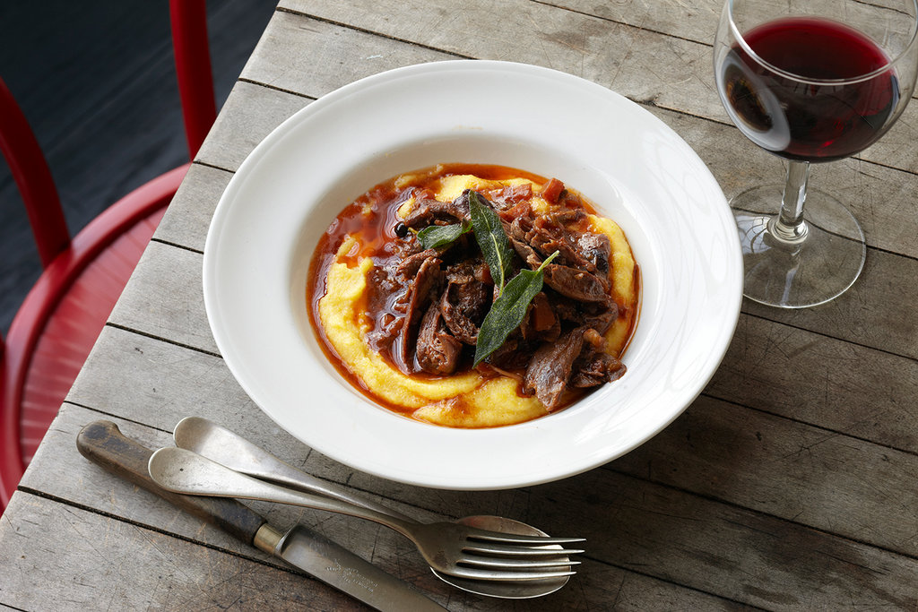 This is a home cook’s version of a wild-shot brant ragù cooked by Dave Pasternack of Esca in Manhattan. He served it thick and dark, a kind of tomato jam knit together with heavy shreds of meat, riding a polenta raft: poultry that looked like pork and tasted of fish, a combination to reel the mind. It was food of deep intensity and flavor, and it led to crazy, vivid dreams. Made with farmed duck amped up with anchovies, juniper, and vinegar it becomes a dish of domestic heritage, though with a feral streak, absolutely delicious.