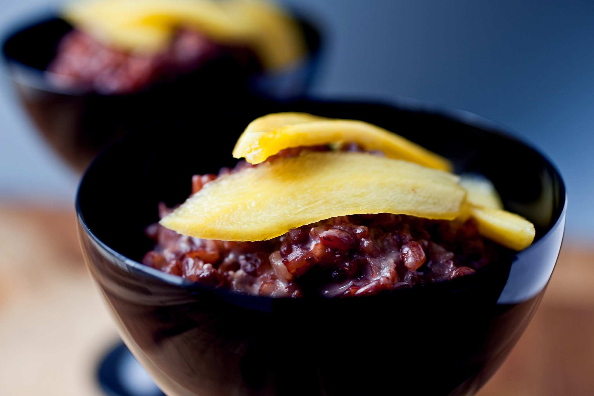 This dish is inspired by a classic Thai sweet made with sticky rice. The red Bhutanese rice has a very nice chewy texture, and the pudding has a light purple-red hue.