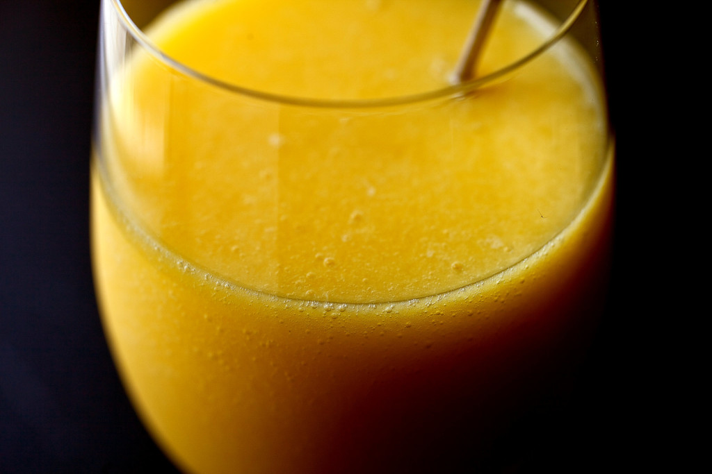- Combine the orange juice, mango, ginger juice and ice cubes in a blender. Blend until frothy and smooth. If you want a thicker drink, add the banana. Serve right away for the best flavor.
