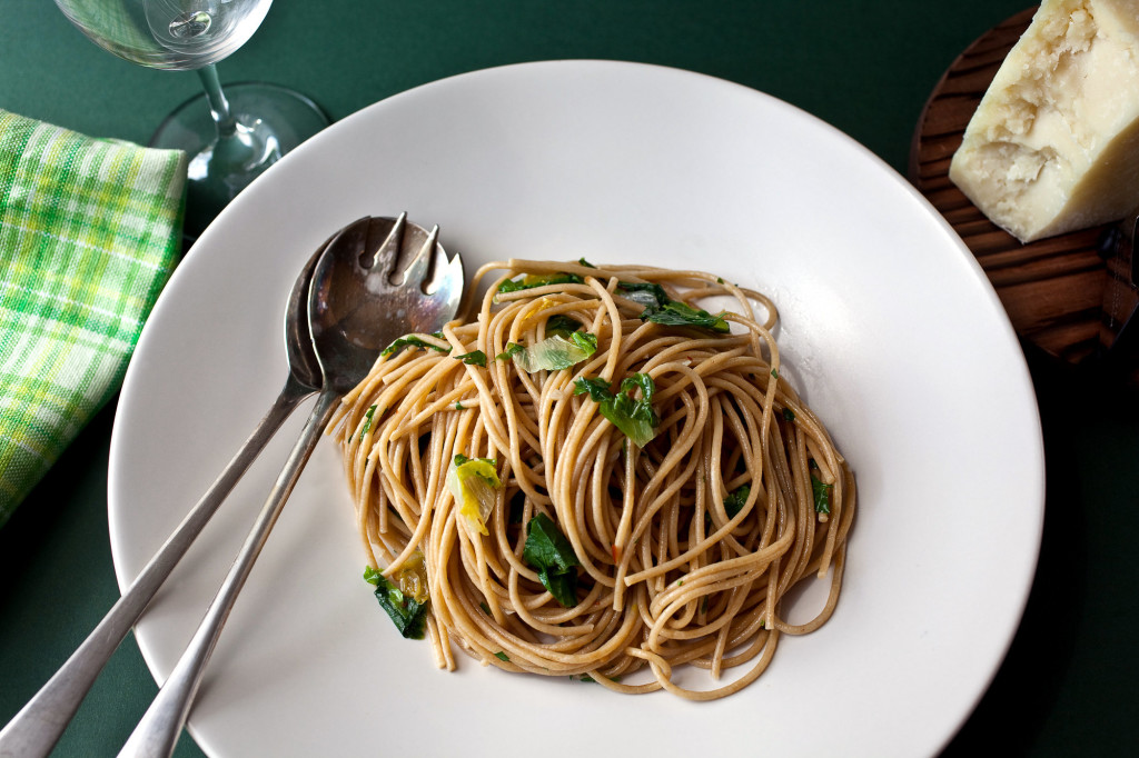 - When the spaghetti is cooked al dente, remove 1/2 cup of the pasta water and add it to the pan with the chicory. Stir together well. Drain the pasta, and toss with the chicory and garlic. Serve, topping each serving with a spoonful of Parmesan.