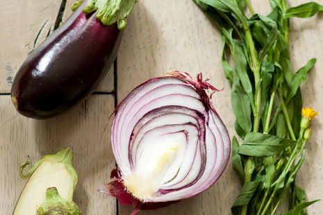 - Add the onions to the skillet and sear on cut sides until browned. Remove. Lower heat to medium and add remaining 2 tablespoons oil. Lightly brown eggplant on cut sides. Remove. Add garlic and olives, cook until the garlic has softened, then add the stock and vinegar. Bring to a simmer, deglazing the pan, then turn off the heat.