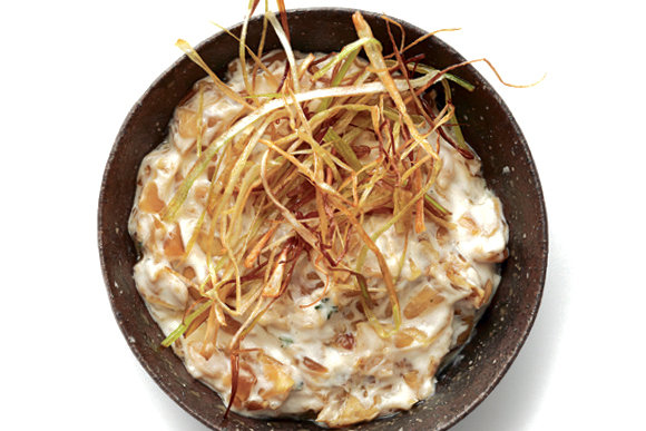 Though onion-powder dip does give me a teenage memory buzz, I remember equally well the time I first slow-cooked a batch of onions, watching them easily turn from white to pale yellow to walnut (at which point you have to start minding them with care). These caramelized babies form the basis of scores of top-notch dishes, from onion soup to real Indian stews and sauces, but nowhere are they better used than as the basis for a dip: stir them, along with some lemon juice and thyme leaves, into yogurt or sour cream, and you’re on your way to dip nirvana. And just as your mother — or at least mine — made onion-sour-cream dip better with (French’s) canned fried onions, you can also take that idea back a hundred years and improve it: fry some leeks or shallots until they’re crisp. If you can manage to not eat those as you remove them from the pan, they enhance the dip even more.