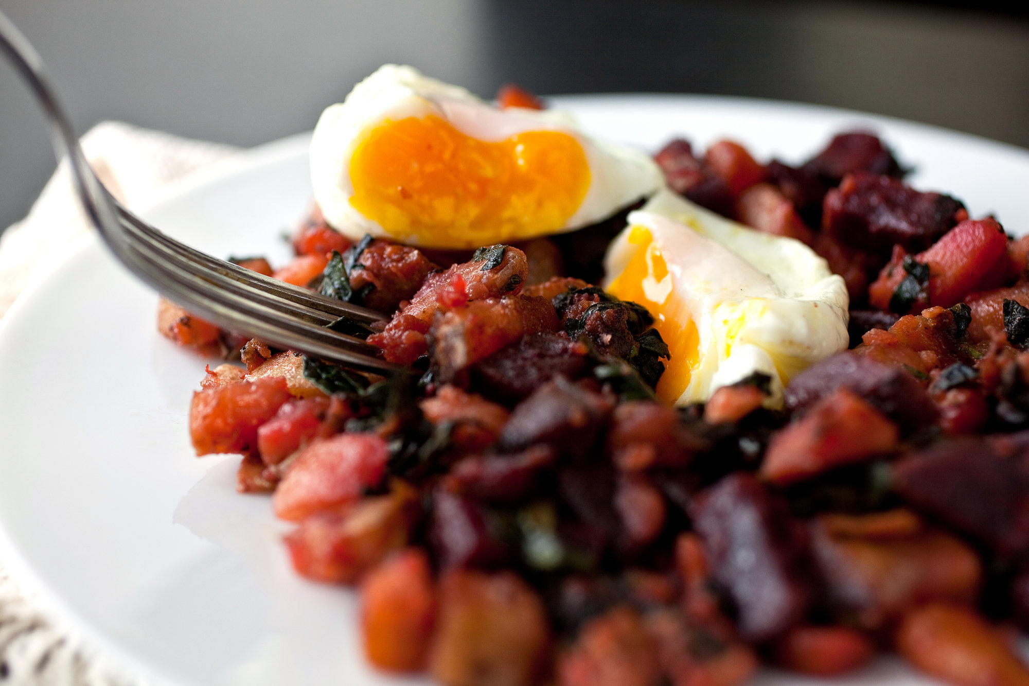 - Heat the olive oil over medium heat in a large, heavy nonstick skillet. Add the potatoes, turn the heat to medium-high, and cook, stirring from time to time, until the potatoes are lightly browned, about five minutes. Stir in the garlic, beets, greens, thyme, salt and pepper. Cook, stirring often, for another five minutes, pressing the mixture down into the pan so the edges brown. Taste, and adjust salt and pepper. Stir in the vinegar if using. Serve, topped with a poached egg if desired.