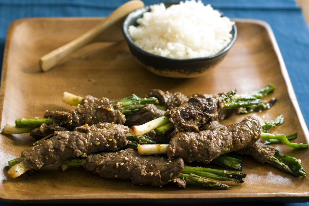 3. Lay a slice of beef on a work surface. Arrange a scallion and an asparagus spear crosswise at a short end and roll up. Add to soy sauce glaze and turn to coat. Repeat with remaining beef rolls.