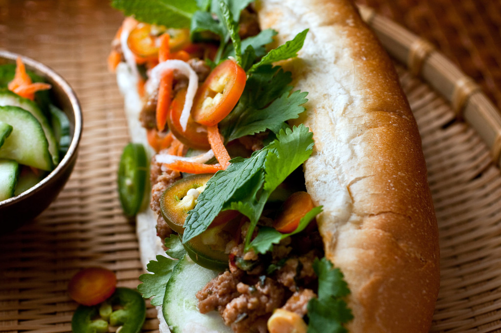 4. Fill bread with pork mixture. Press the jalapeño, mint and cilantro sprigs into the pork. Spoon some pickled vegetables onto the sandwiches and serve any extra alongside.