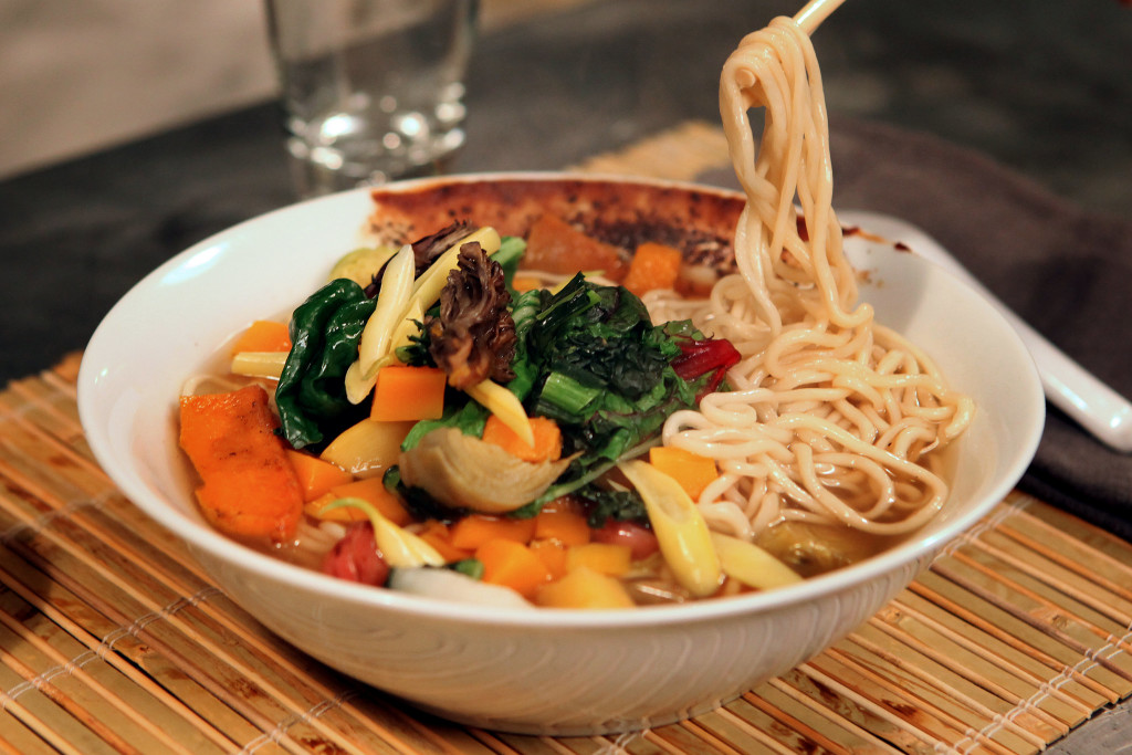 - Boil noodles in plenty of salted water, then drain. Divide among 6 to 8 bowls. Divide roasted squash pieces and cooked vegetables on top of noodles. Ladle in broth just to cover noodles and serve immediately.