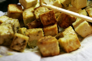 - To make the tofu croutons: Pat tofu very dry on paper towels. Cut tofu into 1/2-inch cubes, and carefully coat in cornstarch. Pour the oil into a wok or small deep-fryer and heat to 350 degrees. Working in batches, if needed, deep-fry the tofu for 5 to 6 minutes, until golden and crispy. Using a slotted spoon, remove the tofu and place on paper towels. Season with salt, and set aside. Discard the oil.