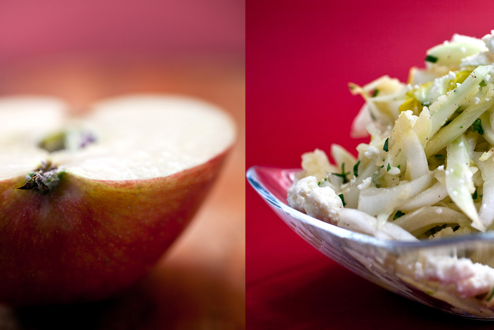 - Peel the apple, and grate into a wide bowl on the large holes of a box grater. Add the lemon juice, and toss together. Add the fennel, endives, tarragon and feta.