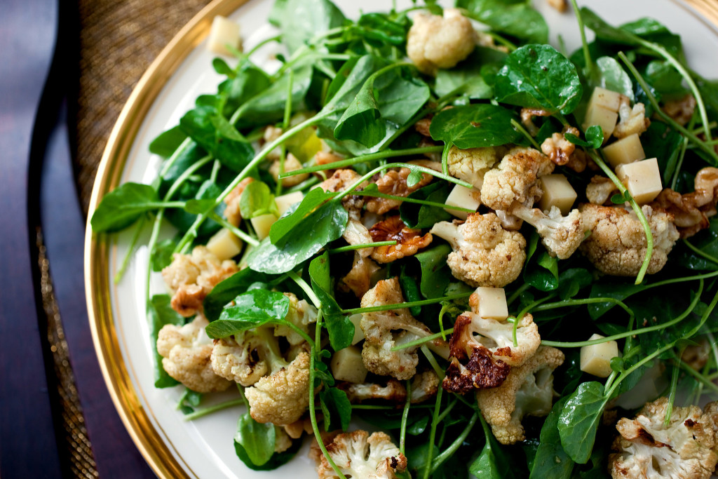 - In a salad bowl, toss the watercress, cheese, nuts and warm cauliflower. Pour the vinaigrette over the salad and toss until well combined.
