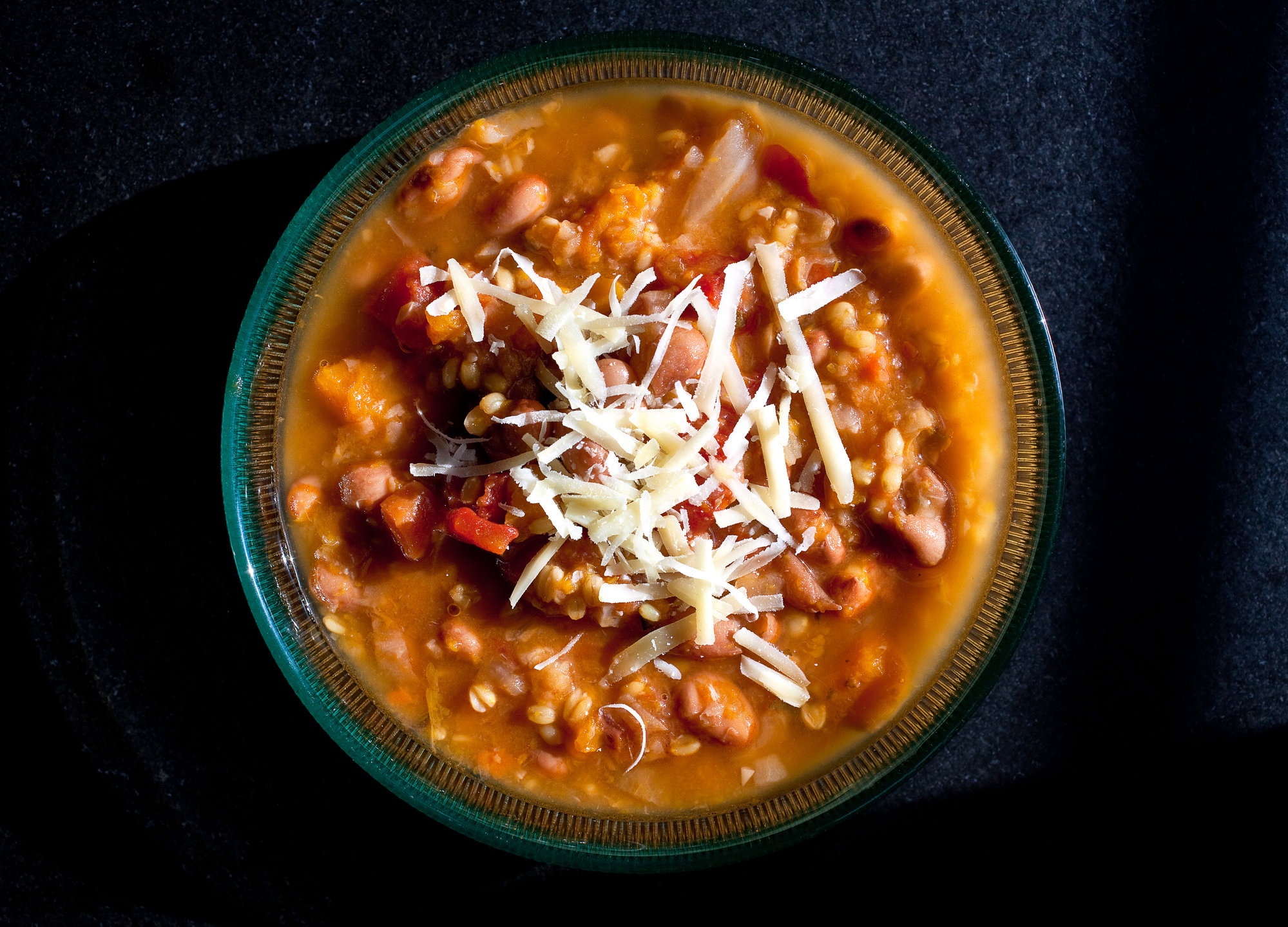 2. While the soup is simmering, heat the remaining olive oil over medium heat in a medium-size nonstick skillet. Add the remaining garlic and the rosemary. Cook for a half-minute to a minute until fragrant, and stir in the tomatoes. Add salt. Cook for 10 to 15 minutes, stirring often, until the tomatoes have cooked down and the mixture is thick, beginning to stick to the pan and delicious. Stir into the soup along with the cooked farro. Continue to simmer for another 30 minutes. Taste and adjust salt, and add lots of freshly ground pepper. Serve with freshly grated Parmesan.