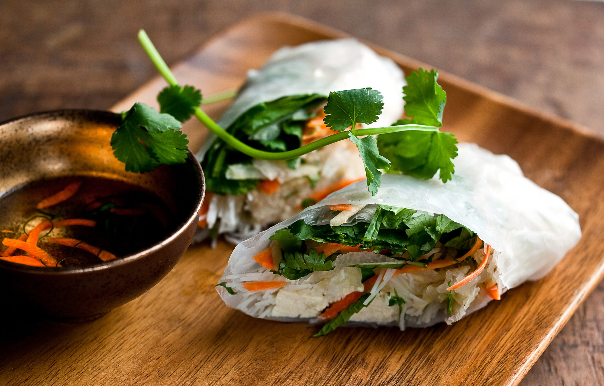 - One at a time, place a rice flour wrapper in the bowl of warm water until just softened. Remove from the water and drain briefly on a kitchen towel. Place the softened wrapper on your work surface and put a line of tofu slices in the middle of the wrapper, slightly nearer the edge closest to you, leaving a 1 1/2-inch margin on the sides. Place a small handful of noodles over the tofu, then place a handful of the shredded vegetable mixture over the noodles. Lay a couple of sprigs of cilantro and a Thai basil leaf or a couple of mint leaves on top. Fold the sides of the wrapper over the filling, then roll up tightly. Arrange on a plate and refrigerate until ready to serve.