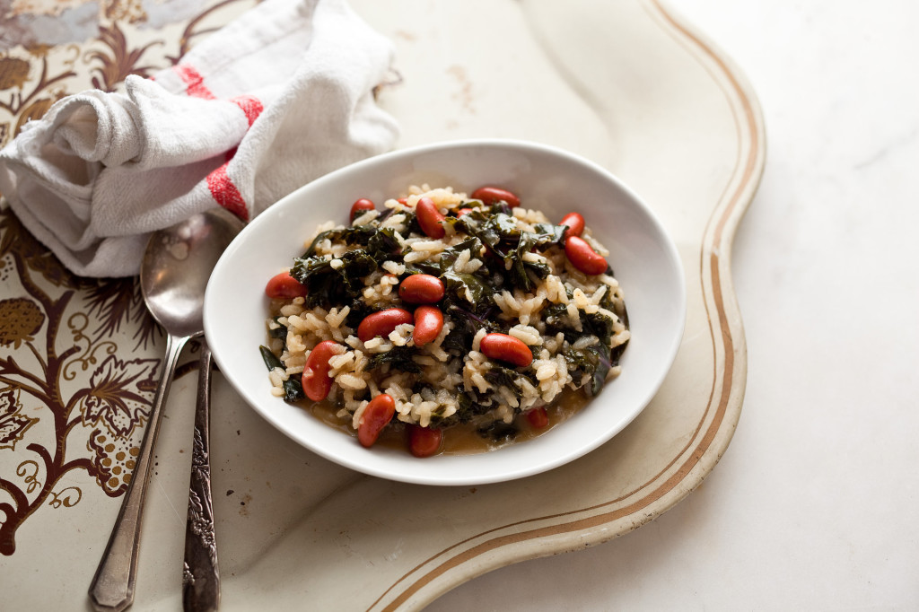 I’m always on the lookout for vegetables with red pigments, a good sign of anthocyanins, those beneficial flavonoids that are known for antioxidant properties and are present in purple and red vegetables. When you cook the kale with the rice, the red in the kale dyes the rice pale pink (the kale goes to a kind of drab green). The first time I made it, without the red beans, the finished product reminded me of the way the rice looks when I make red beans with rice. So I decided to add red beans to the mix, which provide a healthy dose of protein and fiber, as well as color.