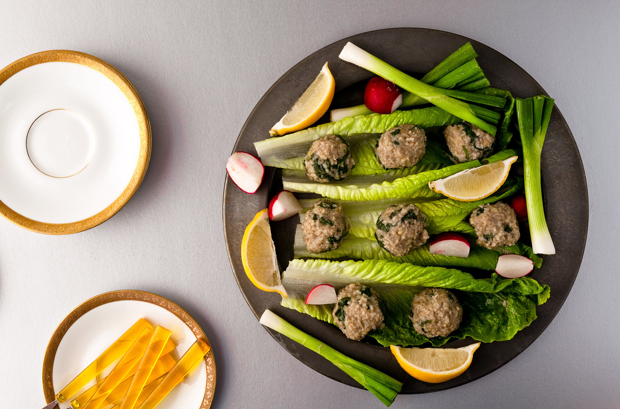 - Moisten your hands and shape the mixture into walnut-size balls (about 1 inch). You’ll have to moisten your hands again whenever the mixture begins to stick to them. Place on a platter, garnish with scallions, radishes, romaine lettuce leaves and lemon wedges, and serve, or chill for several hours. Serve cold or at room temperature.