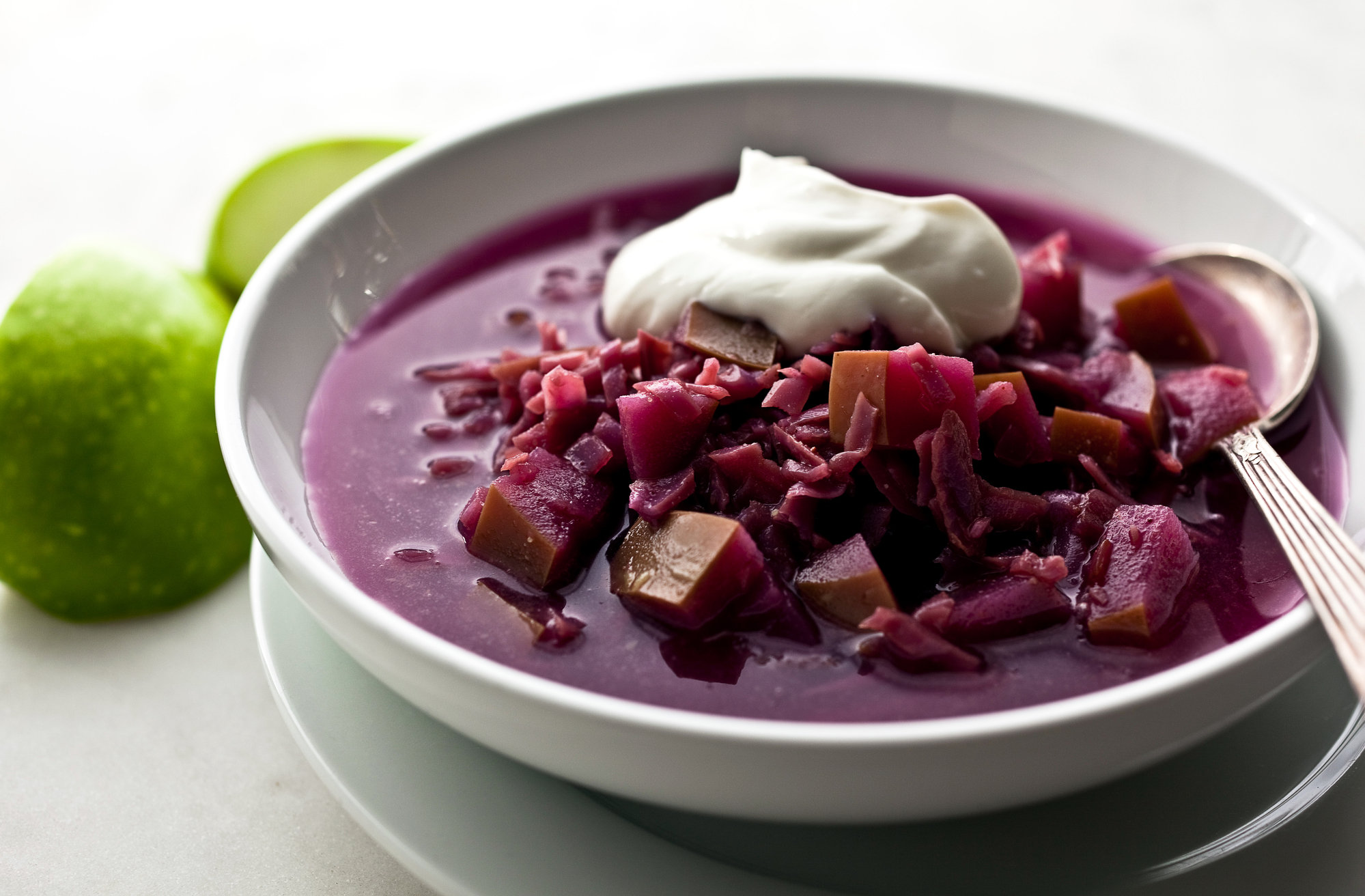 This is a sweet and spicy winter soup, inspired by a classic red cabbage and apple braise. The yogurt is important here; it enriches the soup at the end. You could also use fat-free sour cream.