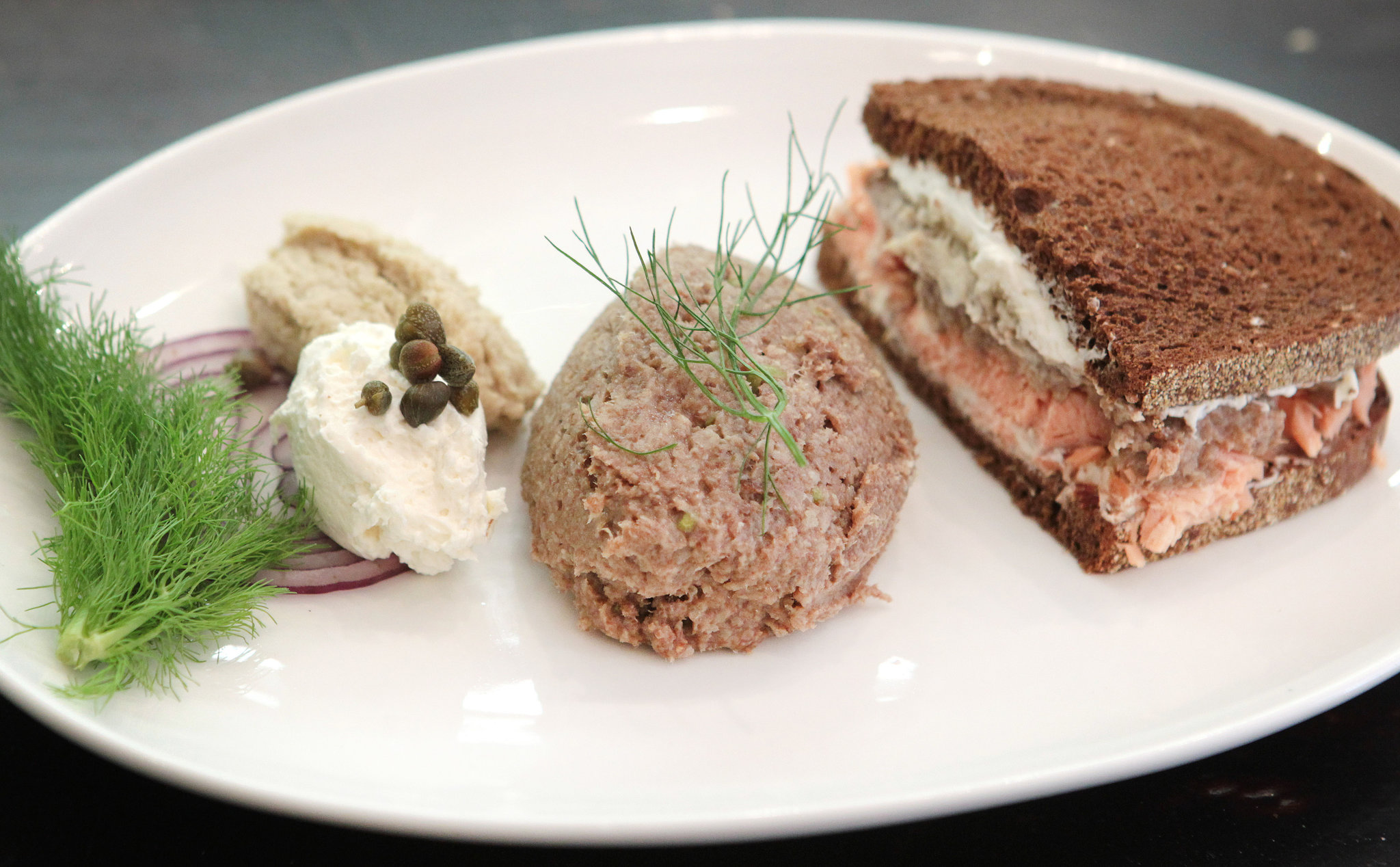 - Spread the cream cheese on one slice of the rye bread. Press the smoked salmon into the cream cheese. Spoon the reserved apple horseradish over the salmon. Spread the reserved pickled herring salad onto the second slice of bread. Put the 2 sides together.