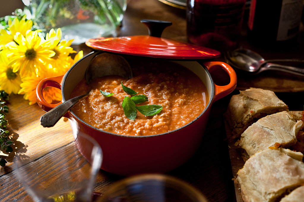 4. Using an immersion blender, blender or food processor, purée the tomato mixture until smooth (you may have to do this in batches). Add half the farro and pulse until the grains are broken down and the soup is a chunky purée. Stir in the remaining farro. If the soup seems thick, add more cooking liquid. Taste and add more salt if needed. Ladle the soup into serving bowls. Drizzle with oil; top generously with black pepper and torn basil leaves.