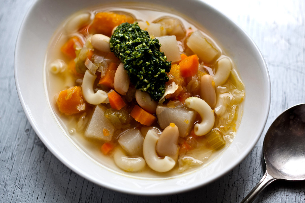 - While the soup is simmering, make the pistou if you don’t already have some in your freezer.