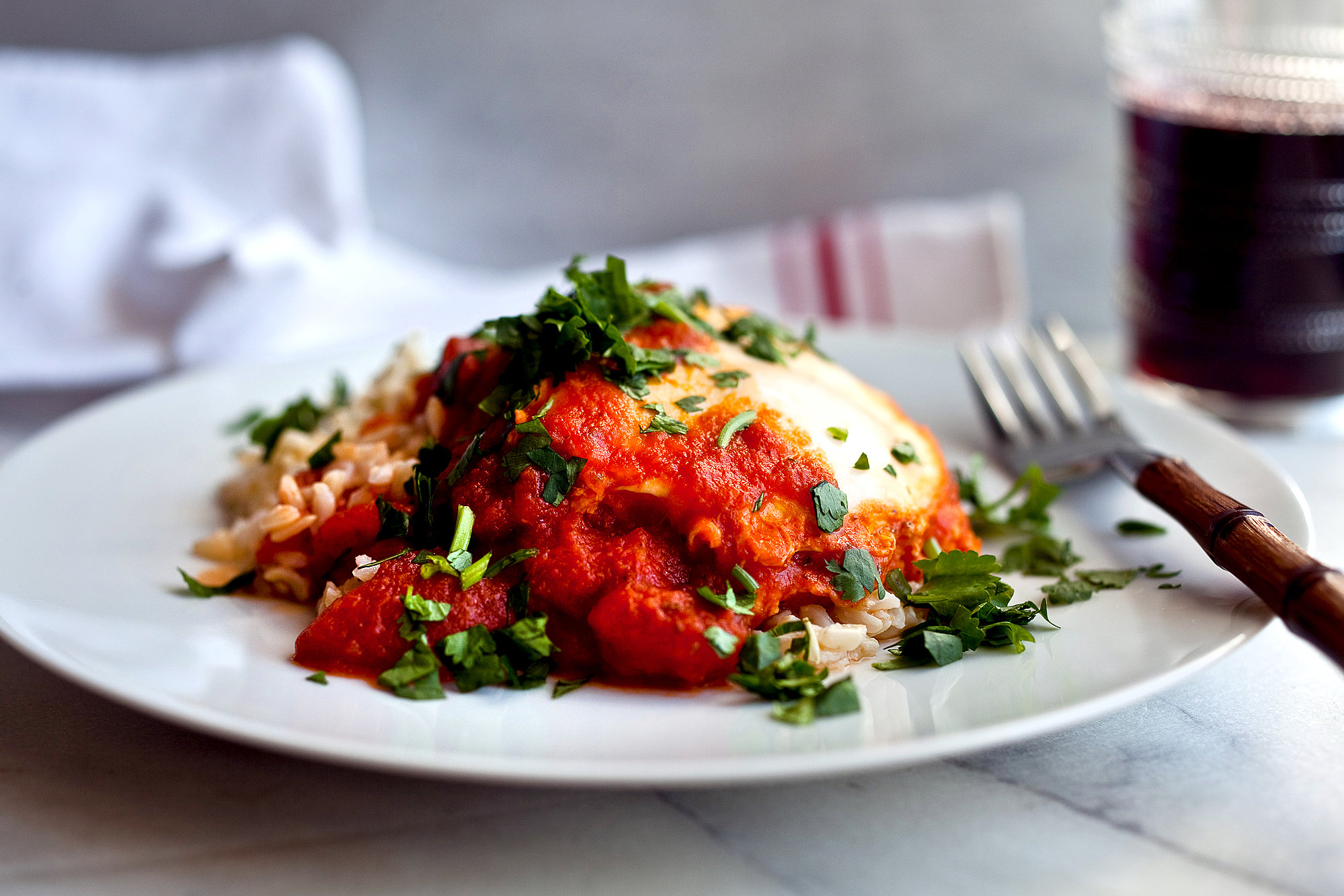 - For one serving, remove all but about 1/2 cup of the sauce from the pan and reserve for another time. Bring the sauce in the pan to a simmer. Break the egg or eggs into a teacup, and carefully tip into the tomato sauce. Cover the pan and simmer over low heat for 3 to 4 minutes, until the tops of the whites are set but the yellow yolks show through. It’s important that the yolk be runny. Turn off the heat. Season the eggs with salt and pepper to taste and sprinkle with cilantro. Remove from the heat and serve over basmati rice.