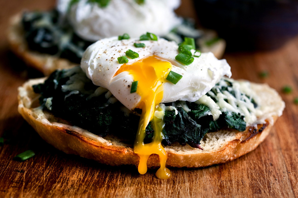 4. Top the toasted bread with the greens. Top the greens with the cheese. Place in a warm oven or a microwave and heat just until the cheese begins to melt. Remove from the heat. Blot the eggs dry if they are in warm water and place on top of the greens. Sprinkle with salt, pepper and chives, and enjoy.