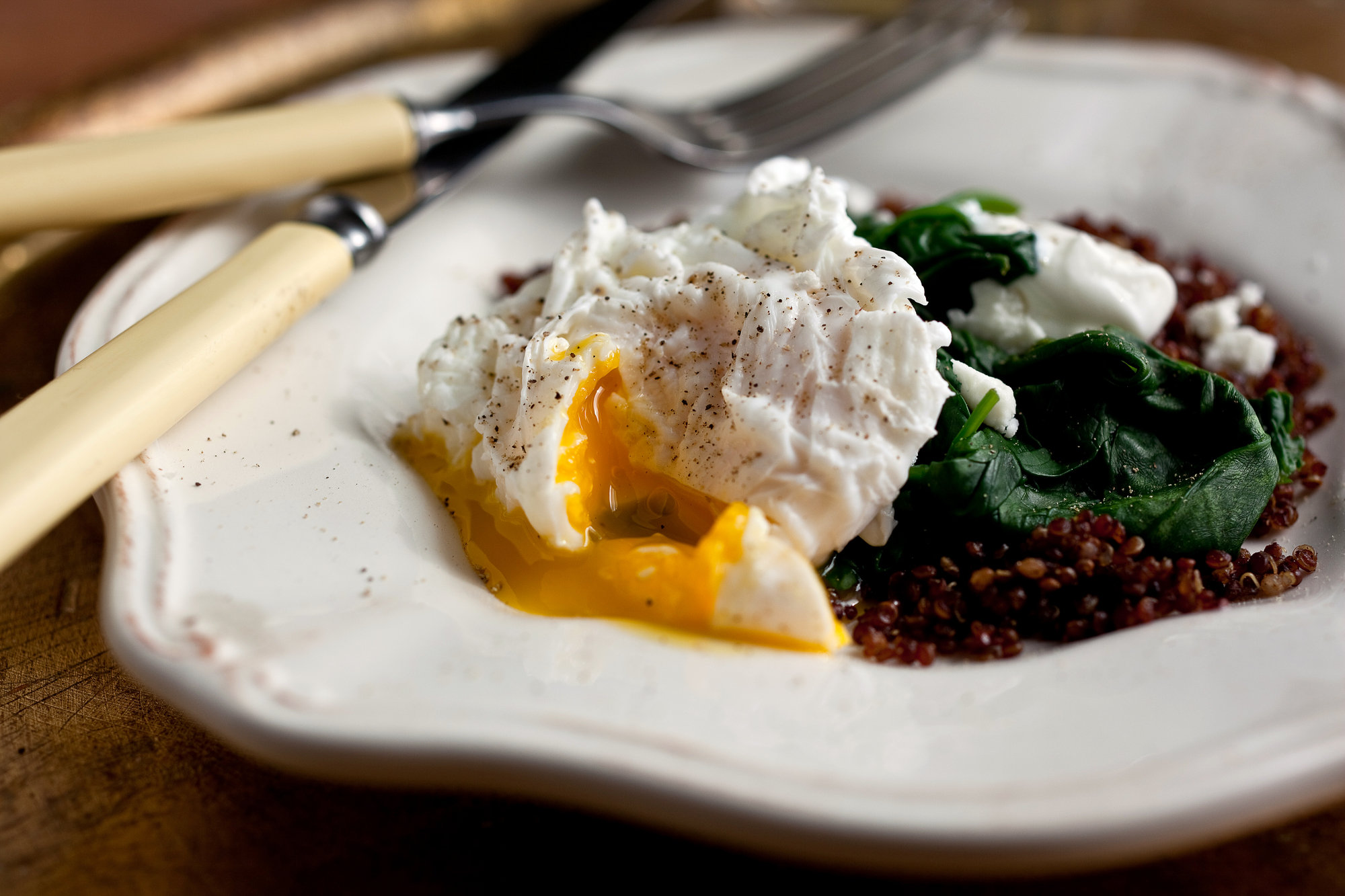 - Arrange the quinoa in the center of a dinner plate and make a well in the middle. Pile the spinach into the well. Top with the poached egg or eggs and season with salt and pepper. Sprinkle on the feta or spoon on the garlic-spiked yogurt and enjoy.