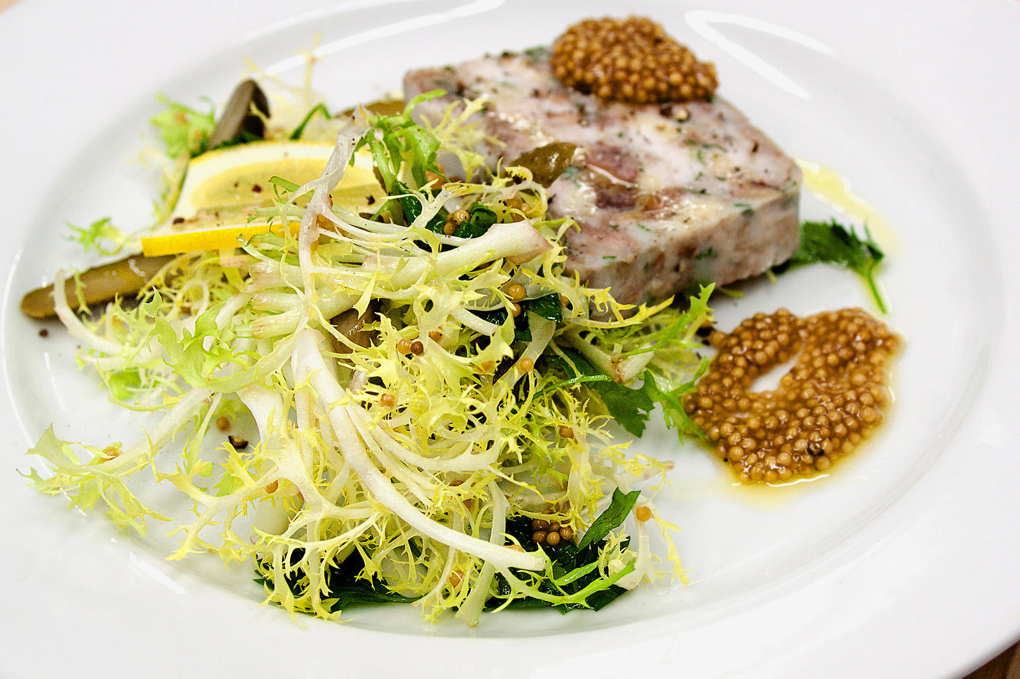 - In a bowl, mix olive oil, lemon juice, reserved mustard seeds, and salt and pepper to taste. Cut the frisée at the root to separate the leaves. Add the frisée, cornichons and parsley to the bowl, and toss to coat with dressing. If desired, serve with pâté or other charcuterie.