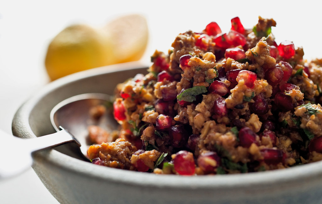 - In a food processor, pulse together the oranges, sugar and pepper and a generous pinch of salt until chunky. Add the walnuts and pulse a few times until the relish comes together. Transfer to a large bowl and stir in the pomegranate seeds and mint.