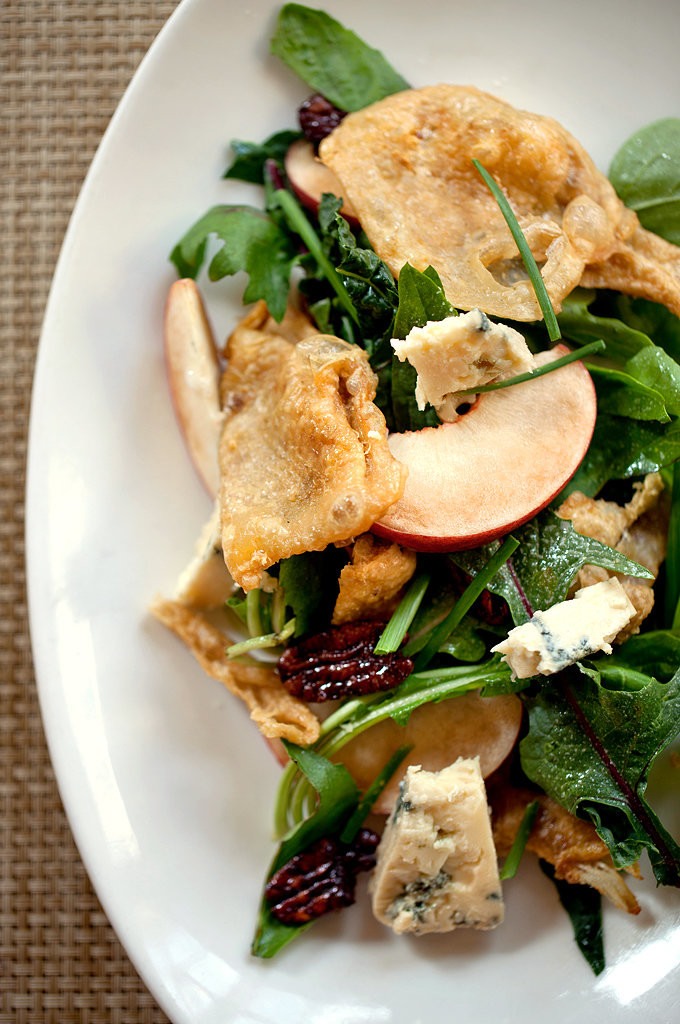 - Soak the red onion in ice water for 30 seconds; drain and blot dry. Combine the onion, pecans, vinegar and oil in a bowl and mix thoroughly. Season with salt, pepper and honey to taste. Toss the lettuce and herbs in the bowl to lightly coat with the dressing. Divide the salad between two bowls. Top each with an equal amount peaches and blue cheese. Garnish each with a crisped chicken skin.