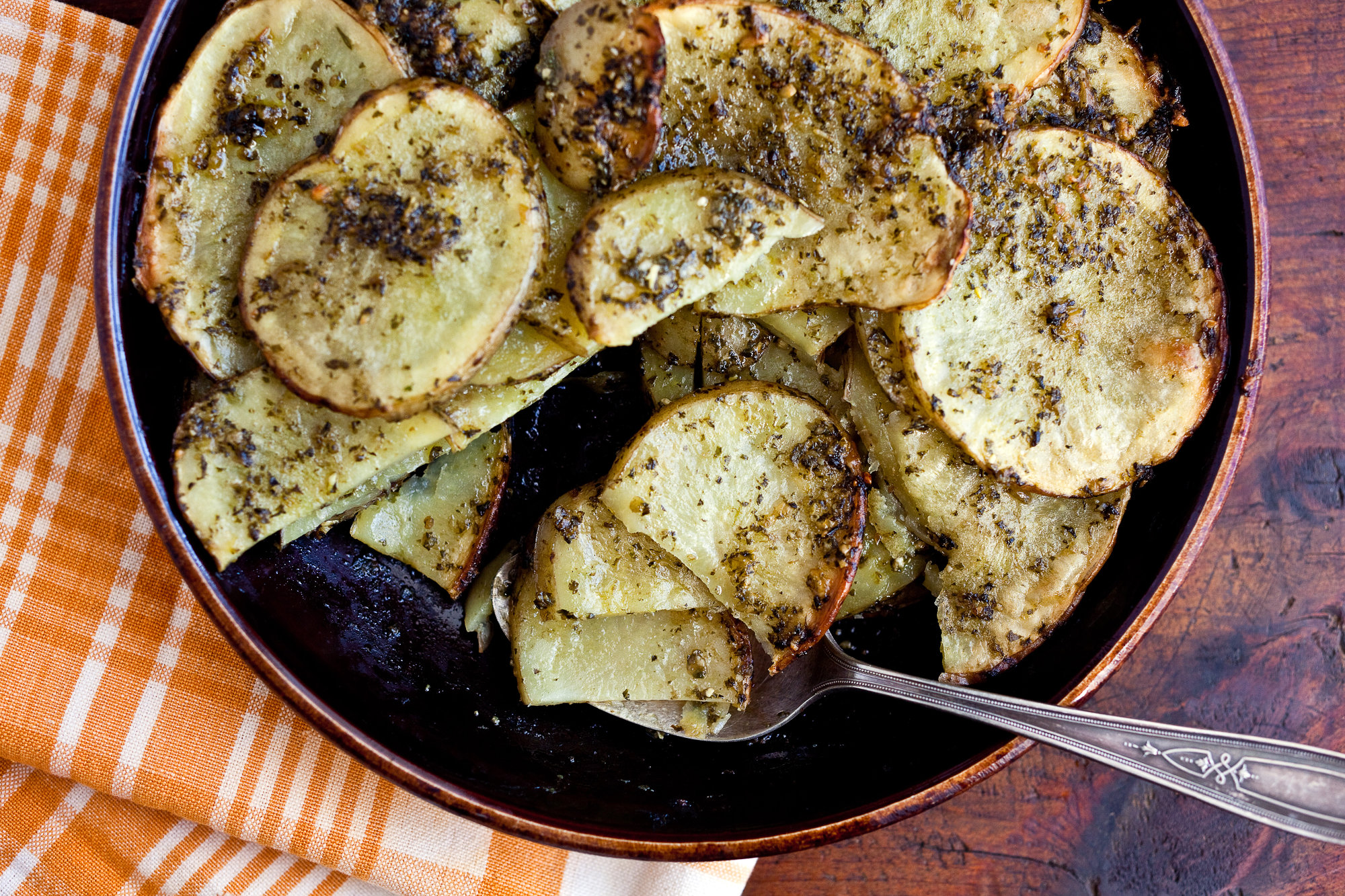 - Cover the baking dish with foil or a lid and place in the oven. Bake 30 minutes, then uncover and return to the oven. Bake another 15 to 20 minutes, until the potatoes are thoroughly tender, the olive oil in the dish — now a beautiful green — is sizzling, and the top is beginning to color. Serve hot or warm.