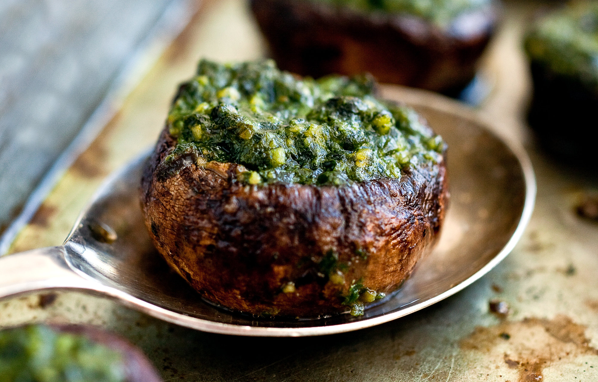 1. Preheat the oven to 400 degrees Fahrenheit. Remove the stems of the mushrooms, and carefully scrape away the gills using a spoon. Toss with the olive oil and season with salt and pepper. Place, rounded side down, on a lightly oiled baking sheet. Place in the oven and roast for 8 to 10 minutes, until the mushrooms are beginning to soften and throw off liquid. Remove from the heat and fill with the pesto. Return to the oven and continue to roast until thoroughly softened, about 10 more minutes.